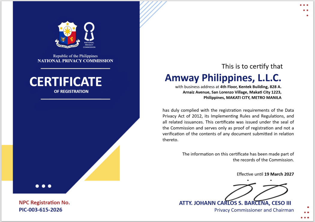 This Privacy Notice describes how Amway Philippines, L.L.C. – 4/F Kentek Bldg., 828 A. Arnaiz Avenue, San Lorenzo Village, Makati City 1223, Philippines (“Amway” or “we” or “us”) uses personal data collected or received from Amway Business Owners and/or Provisional Amway Business Owners (“ABOs” or “you”), Member (“Member” or “you”) or Website Visitors (“Website Visitors” or “you”). It describes how we collect or receive your personal data, the types of personal data we process, how we use, share and protect these data, how long we retain these data, your rights with respect to the processing of your personal data, and how you can contact us about our privacy practices.